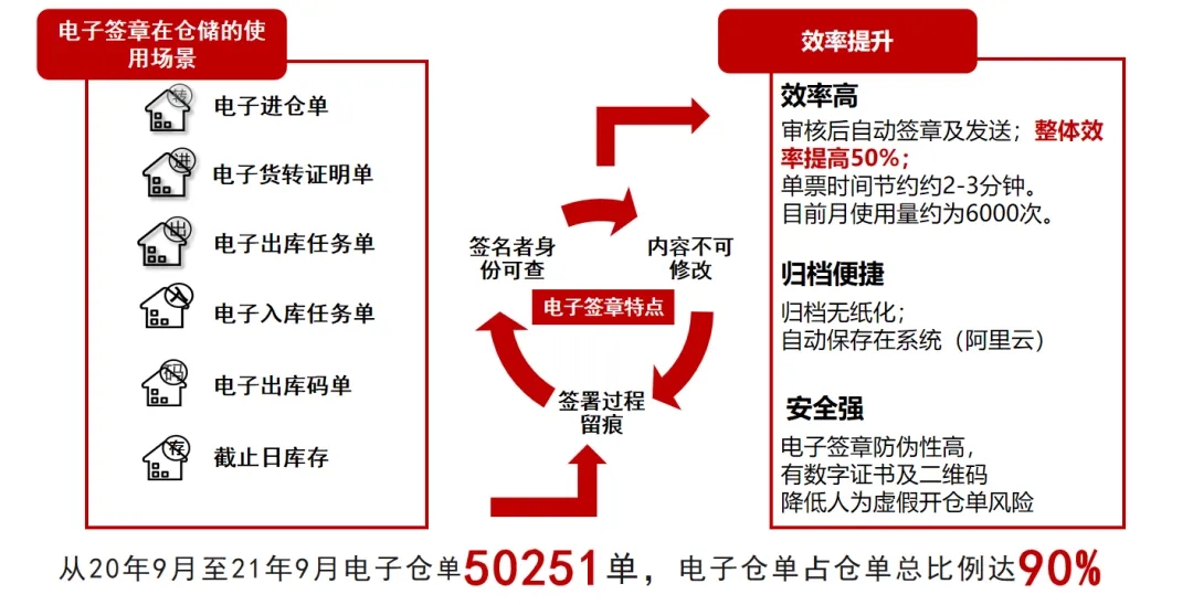 改變紙質(zhì)倉單上“蘿卜章”層出不窮、倉單真實性難以核實,單據(jù)流轉(zhuǎn)效率低的弊病,引入電子簽約平臺,實現(xiàn)全單據(jù)流轉(zhuǎn)數(shù)字化,保障倉單內(nèi)容及簽署方真實性和可溯源,流轉(zhuǎn)效率和可信度大幅提升,整體效率提高了50%。