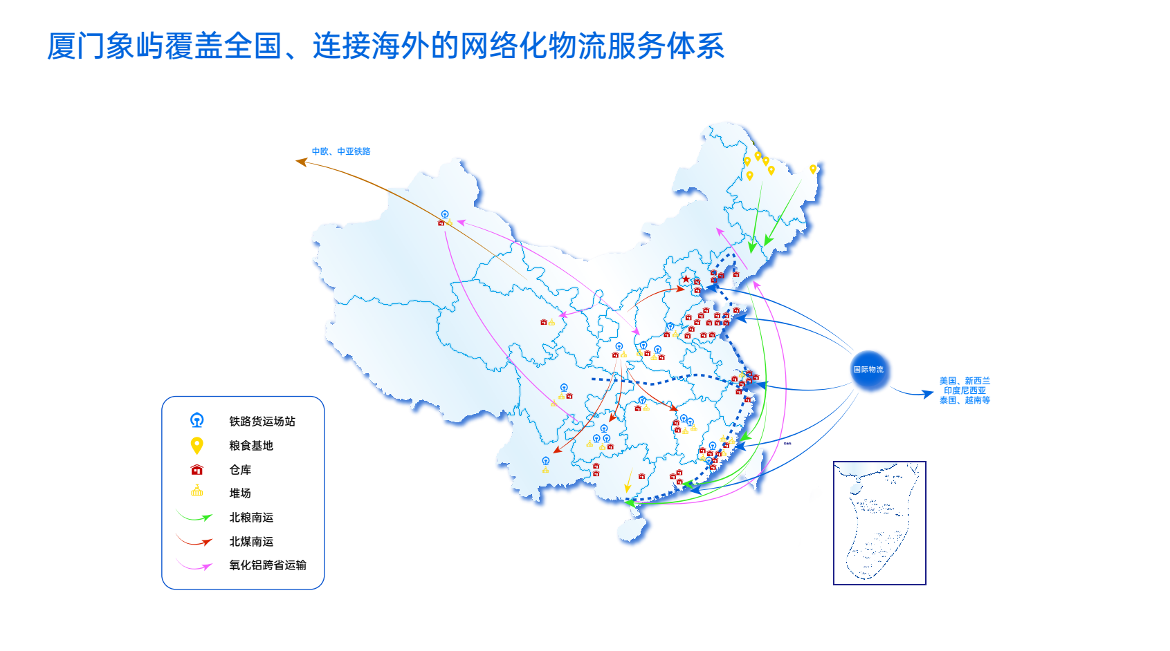立足國內(nèi)貫通中西和串聯(lián)南北的鐵路運(yùn)輸網(wǎng)絡(luò)、輻射全國的公路運(yùn)輸網(wǎng)絡(luò)以及沿??诎?,通過自有與對(duì)外協(xié)作相結(jié)合的方式不斷拓展倉儲(chǔ)物流網(wǎng)絡(luò)布局,形成覆蓋東部沿海、中西部大宗商品集散區(qū)域的倉儲(chǔ)集群。