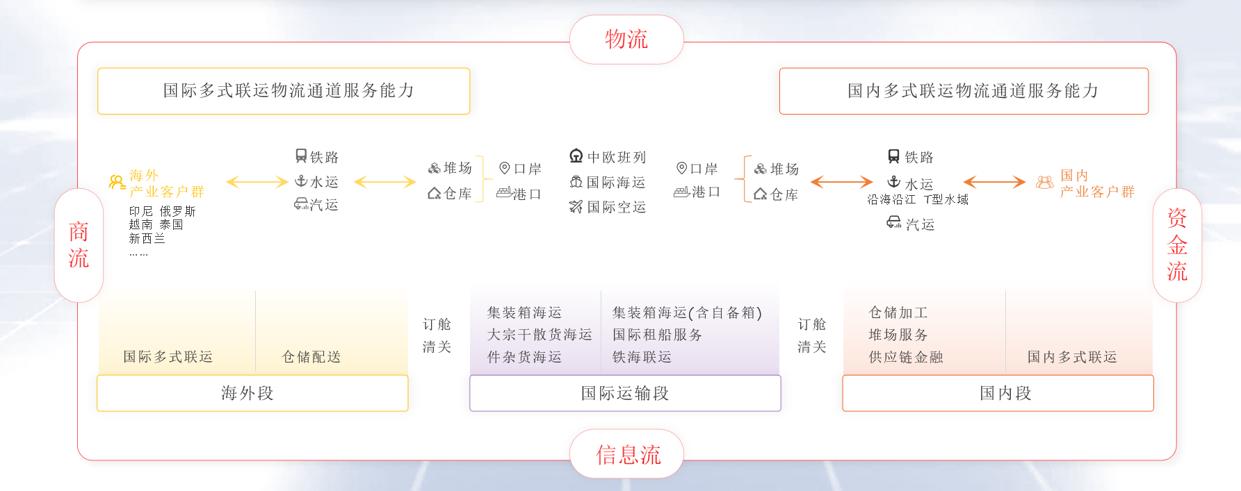 象嶼股份率先構(gòu)建了以“公、鐵、水、倉”為支撐,覆蓋全國、連接海外的網(wǎng)絡(luò)化物流服務(wù)體系,并以“鐵、水”做干線、公路做兩端的經(jīng)營思路,為客戶提供定制化多式聯(lián)運(yùn)解決方案,實現(xiàn)一站式門到門運(yùn)輸。目前,公司已經(jīng)打造出“北糧南運(yùn)”“鋁產(chǎn)品跨省流通”“北煤南運(yùn)”等多條多式聯(lián)運(yùn)物流線路。